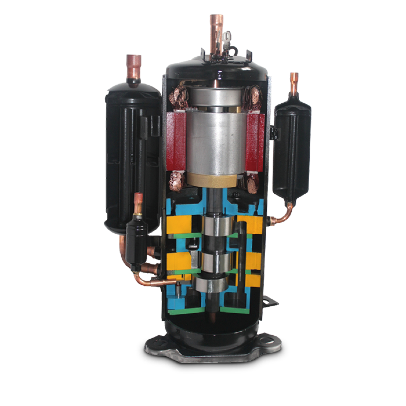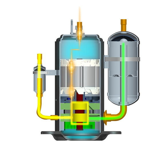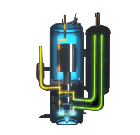 三缸双级变容积比压缩机可实现两种不同容积比的双级压缩,可降低单个气缸的压缩比,减小了泄漏量,提高了压缩机的容积效率,与单级压缩系统相比,双级增焓压缩系统具有能力高、能效高和可靠性高的优势,使用在家用热泵空调、多联式热泵空调、户用冷水热泵机组等多种类型的热泵产品中。