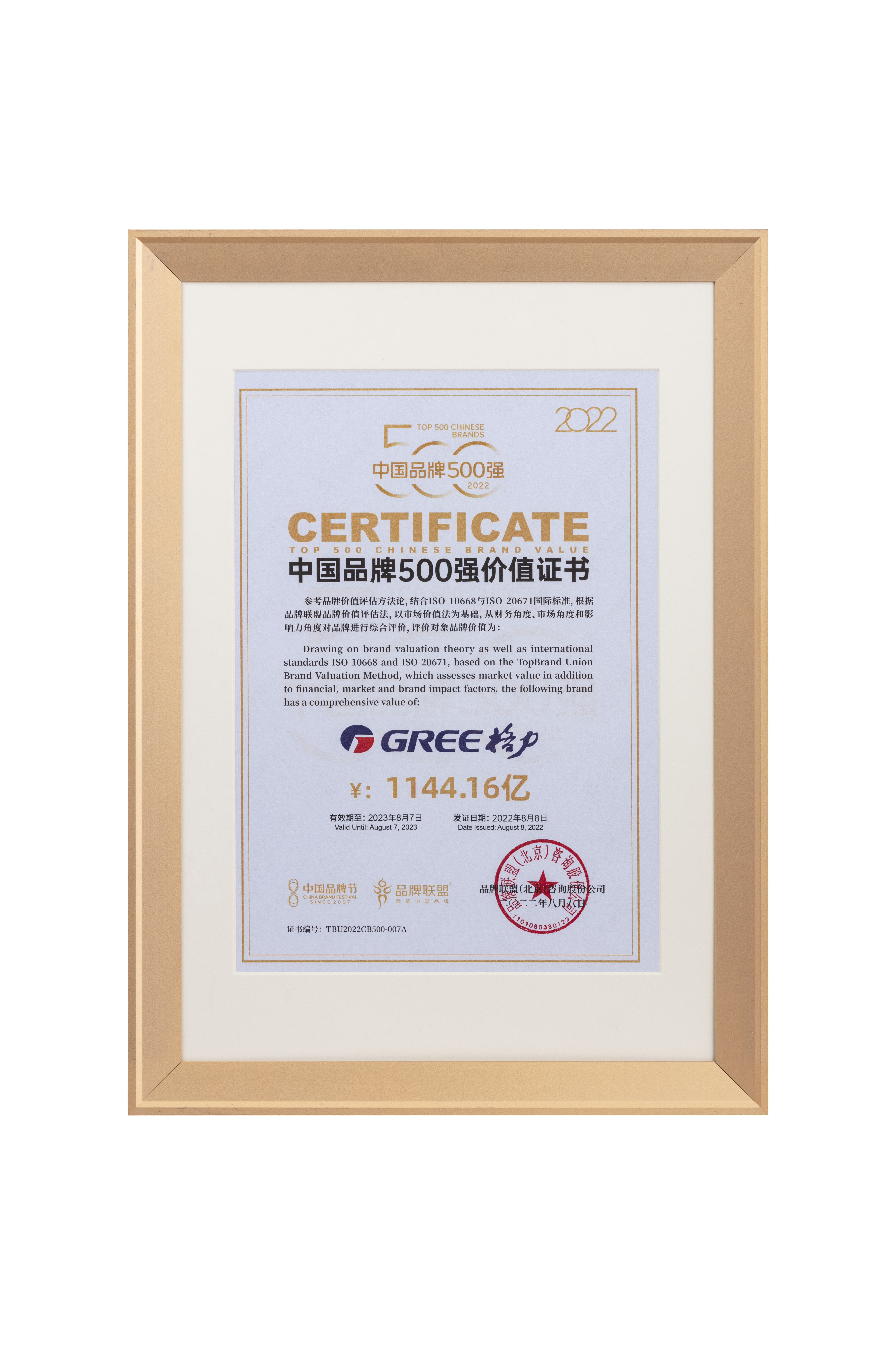 • 2022年中国品牌500强价值证书